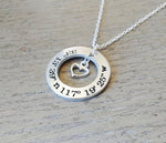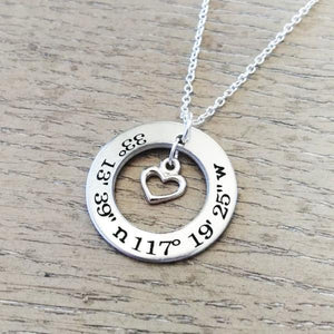 This darling necklace with GPS coordinates also has a sterling silver heart charm, which hangs in the center of the washer pendant. The washer pendant and heart charm hang from an 18" sterling silver link chain. This latitude and longitude necklace is completely customizable to suit you! In the order notes section during checkout, please leave us the latitude and longitude coordinates so that we can make a custom coordinates necklace specific to you!