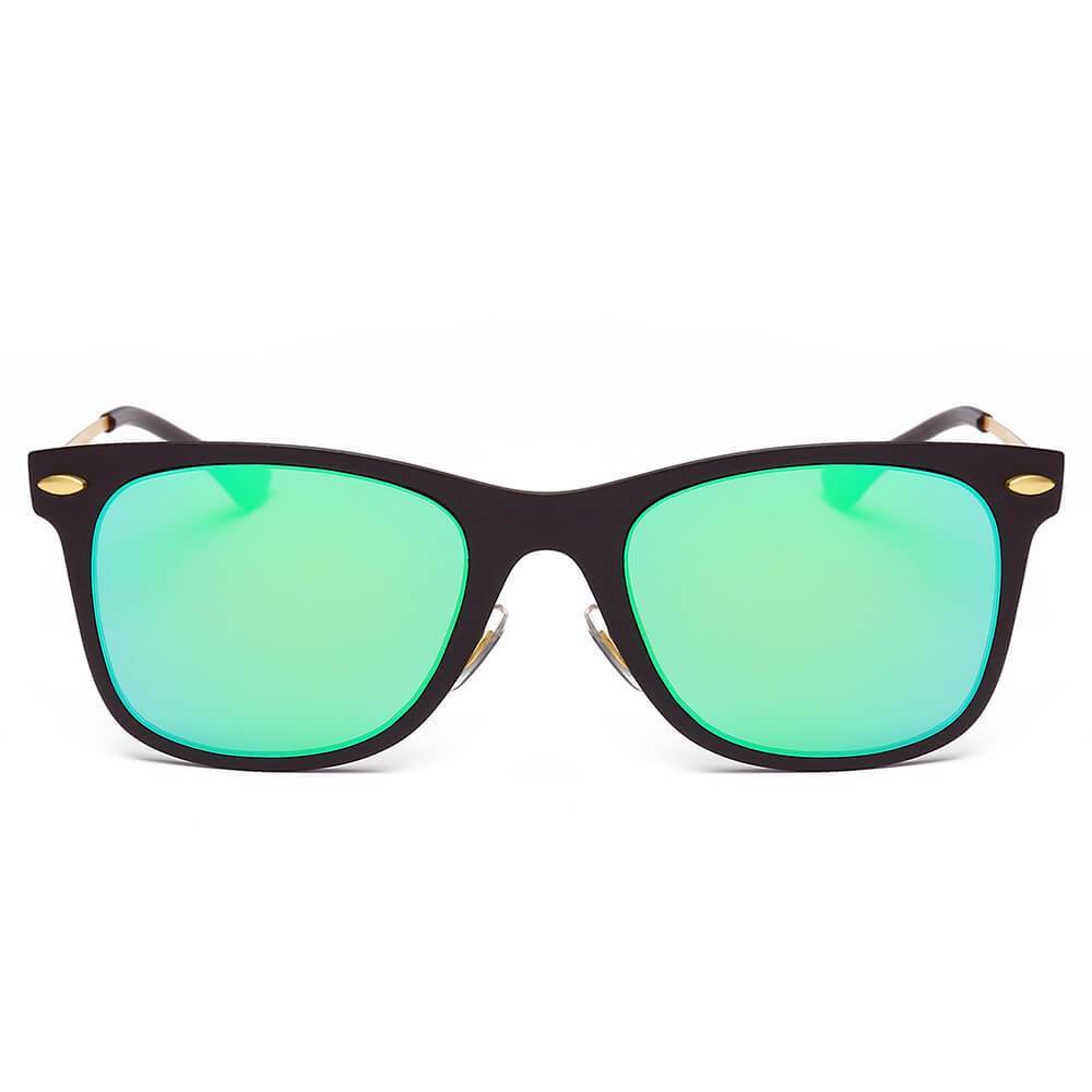 Men's DUGALD | D31 - Classic Horn Rimmed Rectangle Fashion Sunglasses are a lightweight version of the classic wayfarer featuring thin metal arms. The green lens looks green straight on and bluish purple from the side.