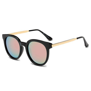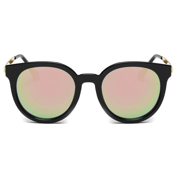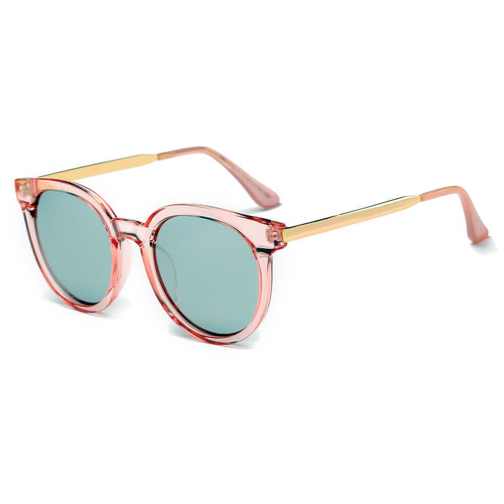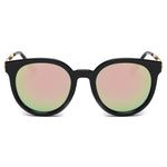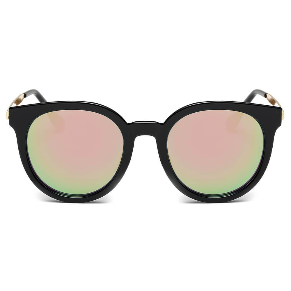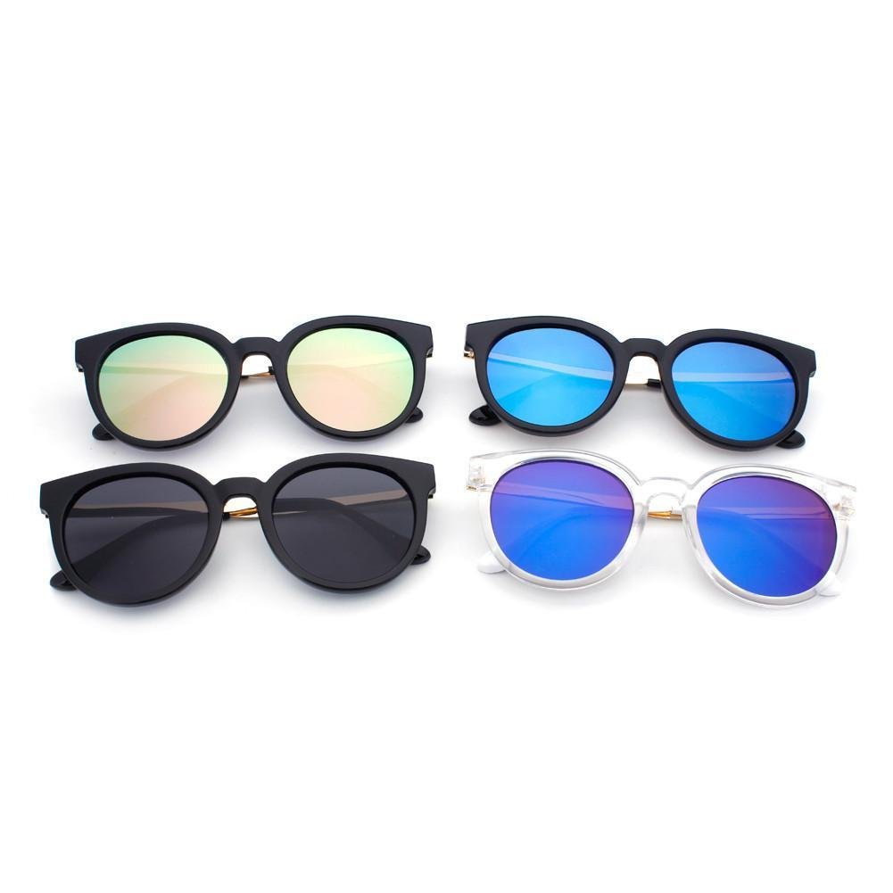 Timeless horned rim shape given a modern twist with black or translucent rims on a lightweight gold frame. Colorful mirrored lenses, made of scratch-resistant polycarbonate material for durability and long term use.