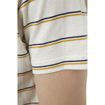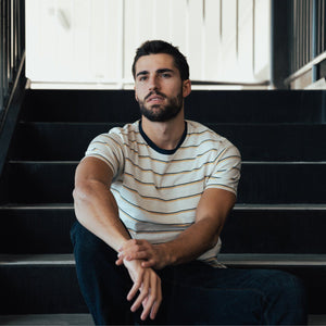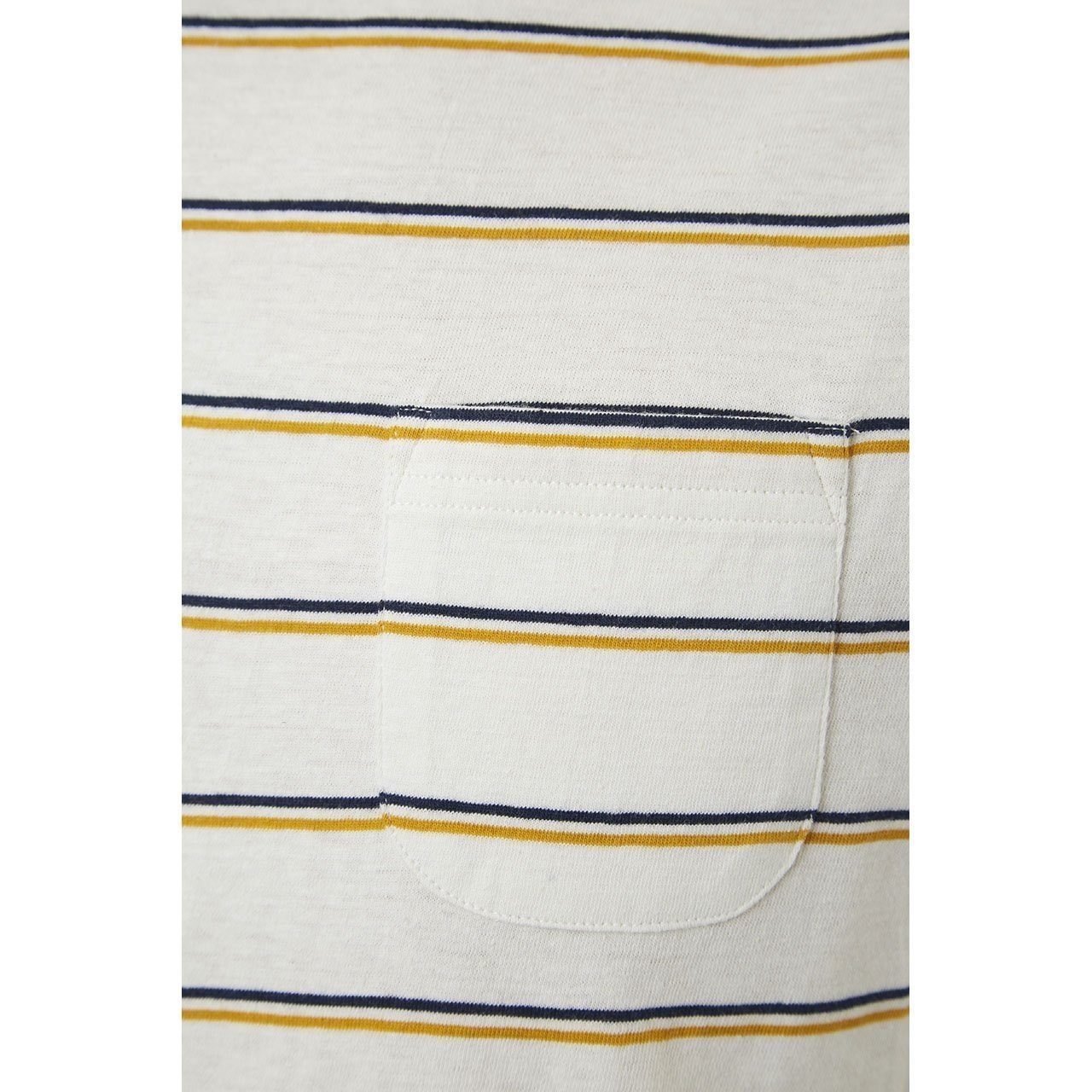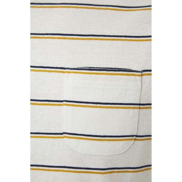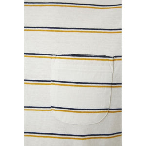 - Short sleeve yarn dye striped crew neck tee with a chambray back yolk and a patch pocket.