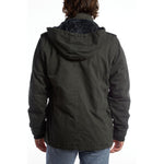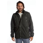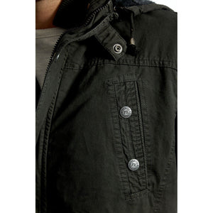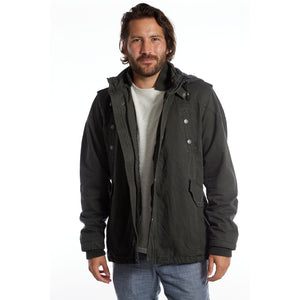 - Garment dyed long jacket with two chest welt pockets and snaps. Two bottom flapped pockets with a detachable hood and sherpa lining.