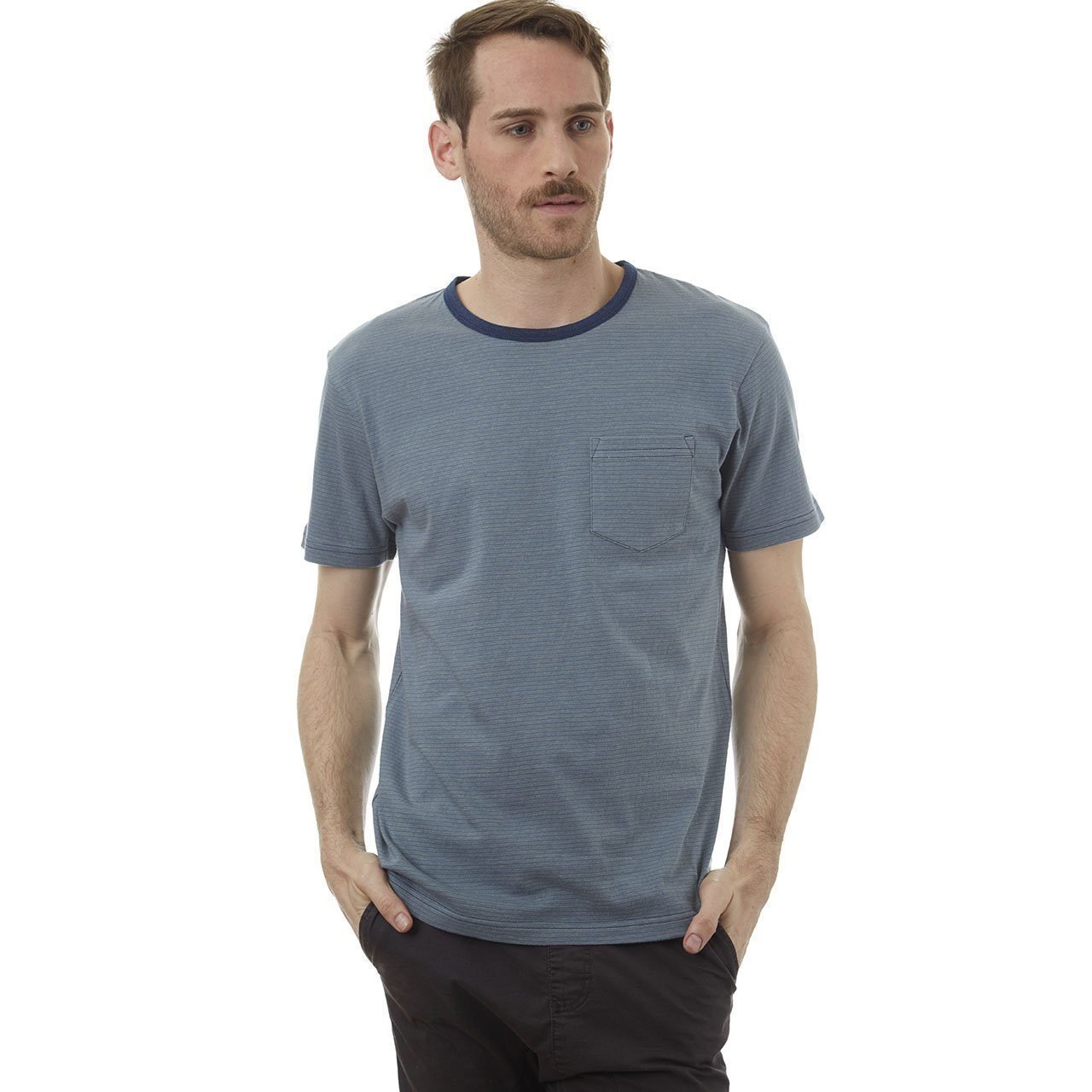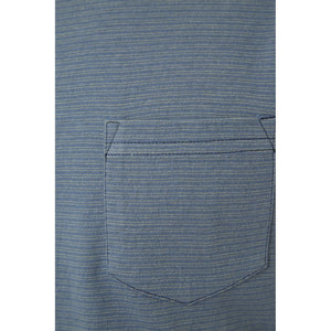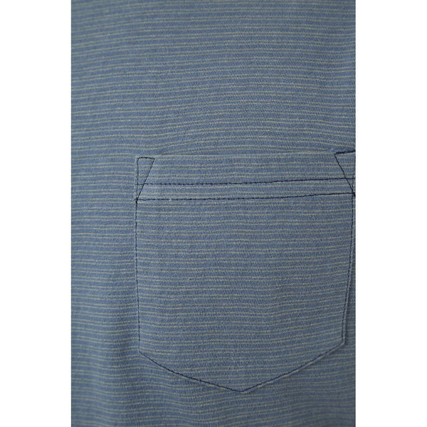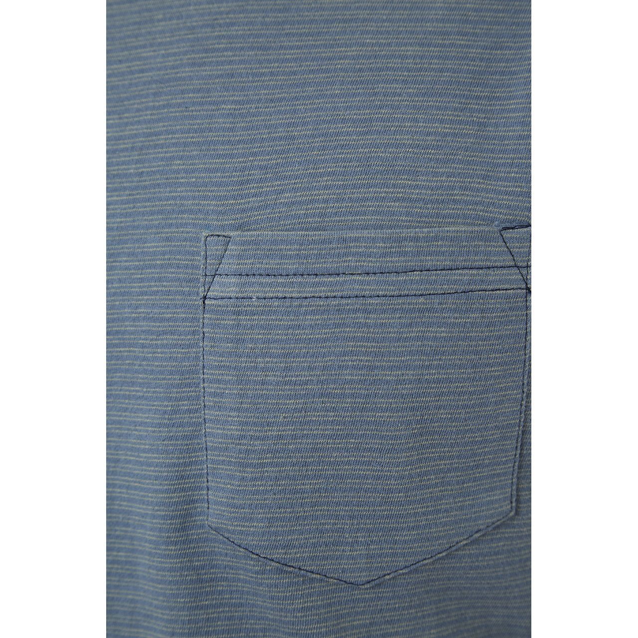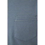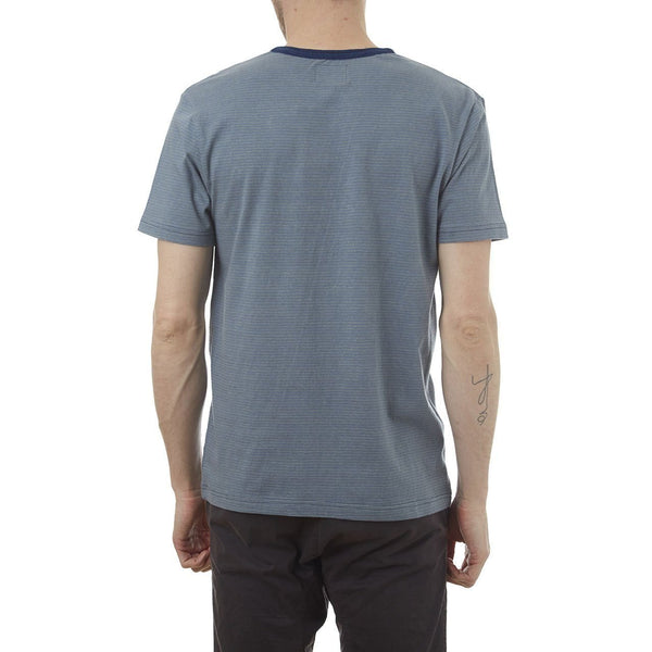 Short sleeve yarn dye striped crew neck tee with a patch pocket and denim yarn neck binding.